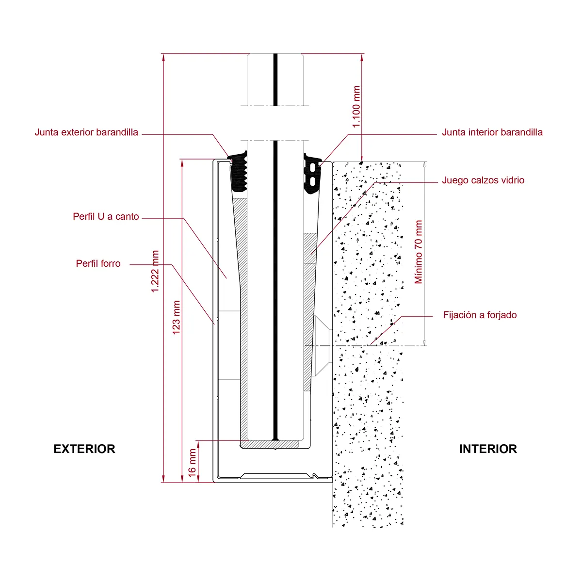 Perfil U a canto de forjado para barandillas de cristal