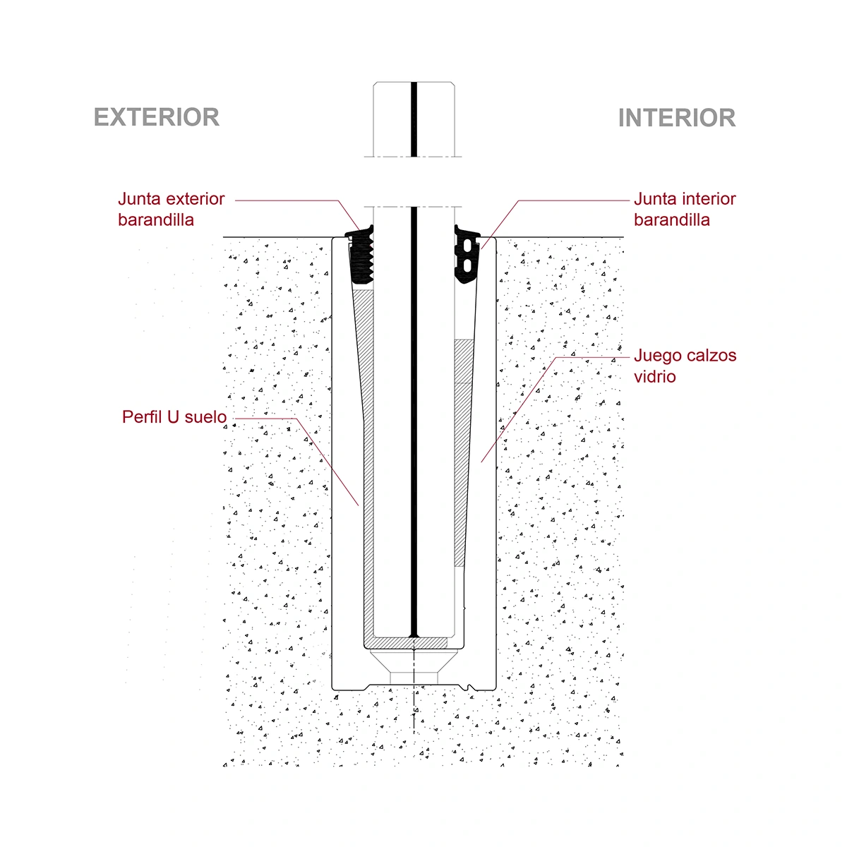 Este perfil se instala directamente sobre el suelo o embutido, permitiendo crear barandillas de vidrio continuas, elegantes y resistentes.